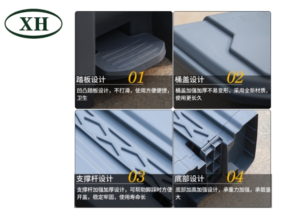 產(chǎn)品介紹腳踩垃圾桶介紹1、密度高的高壓聚乙烯或聚丙稀原材料注塑加工生產(chǎn)制造,使用壽命長。2、要采用全新升級原材料,合理避免弱酸性、···