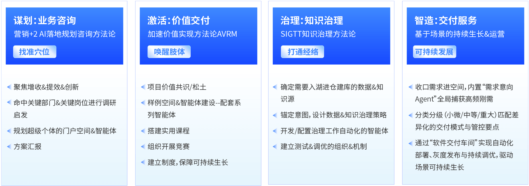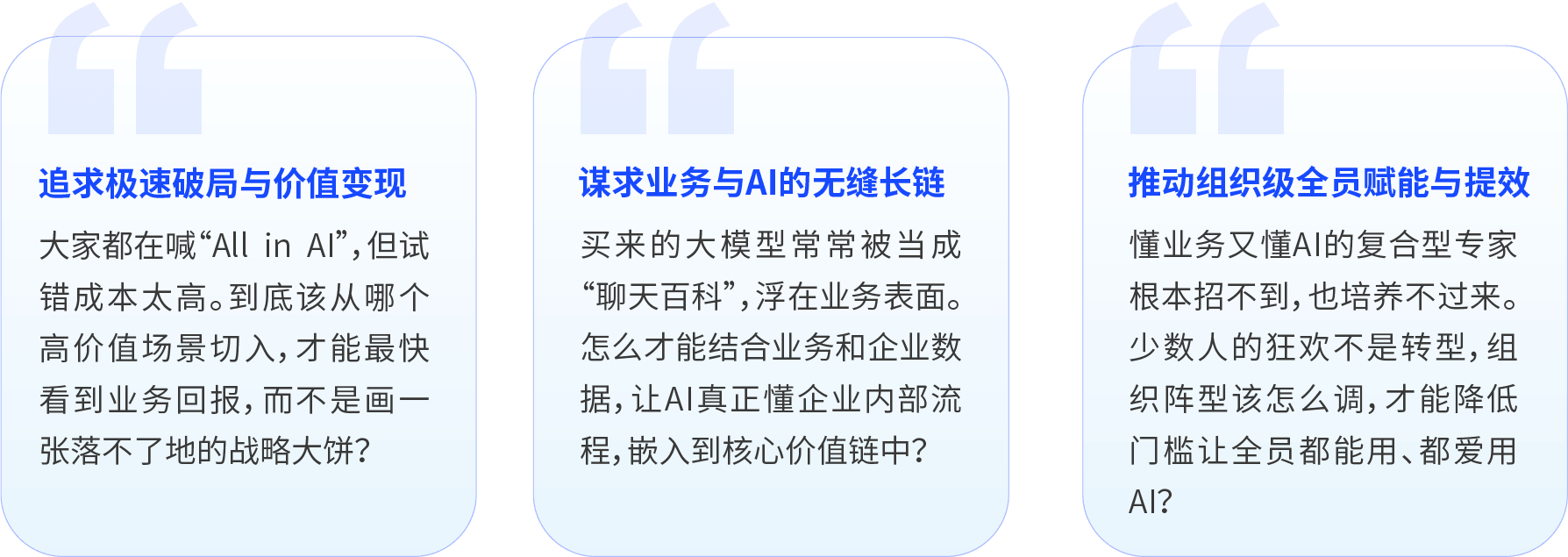 千行百業(yè)擁抱AI升級(jí),面臨“場(chǎng)景碎片化,技術(shù)碎片化,知識(shí)碎片化”的難題。企業(yè)AI成功,解決三大“碎片化”難題,不僅需要聚焦三大價(jià)值(增長(zhǎng)、提效、創(chuàng)新)+三步推導(dǎo)(找到快贏方向、命中關(guān)鍵部門&崗位超級(jí)個(gè)體、空間&智能體原型啟發(fā))的AI轉(zhuǎn)型規(guī)劃,也需要適配的產(chǎn)品三件套+實(shí)施三部曲。