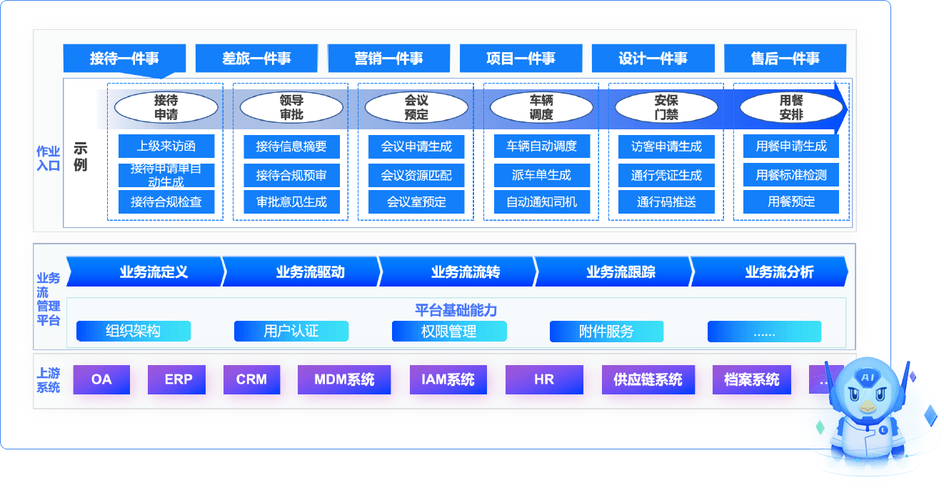 每個(gè)業(yè)務(wù)環(huán)節(jié)嵌入相關(guān)流程、工具(包括智能體)、制度、辦事指南等
