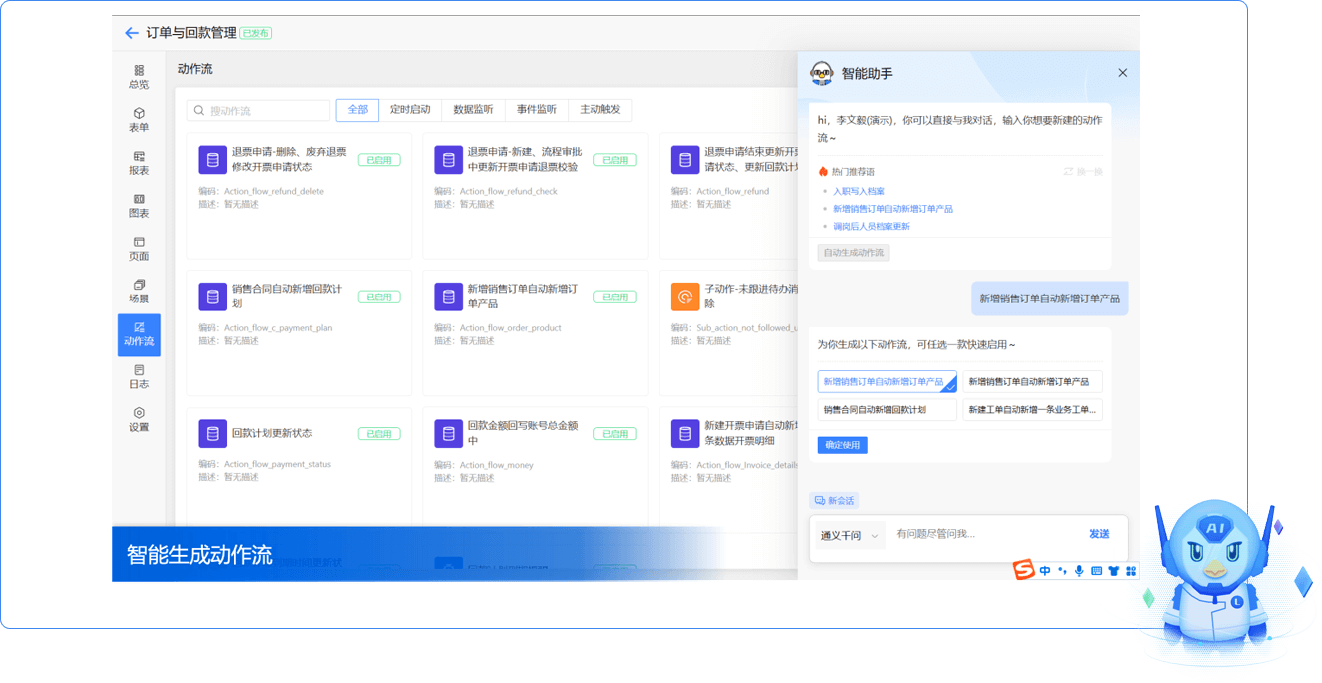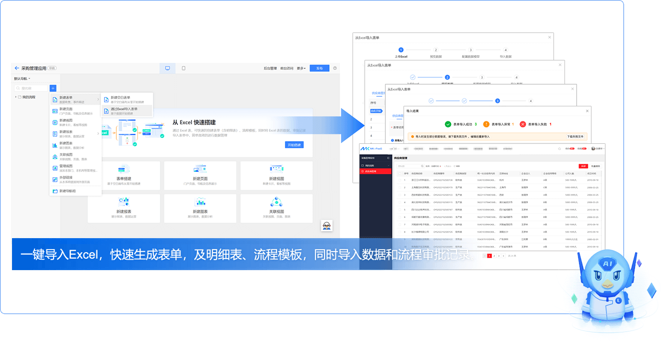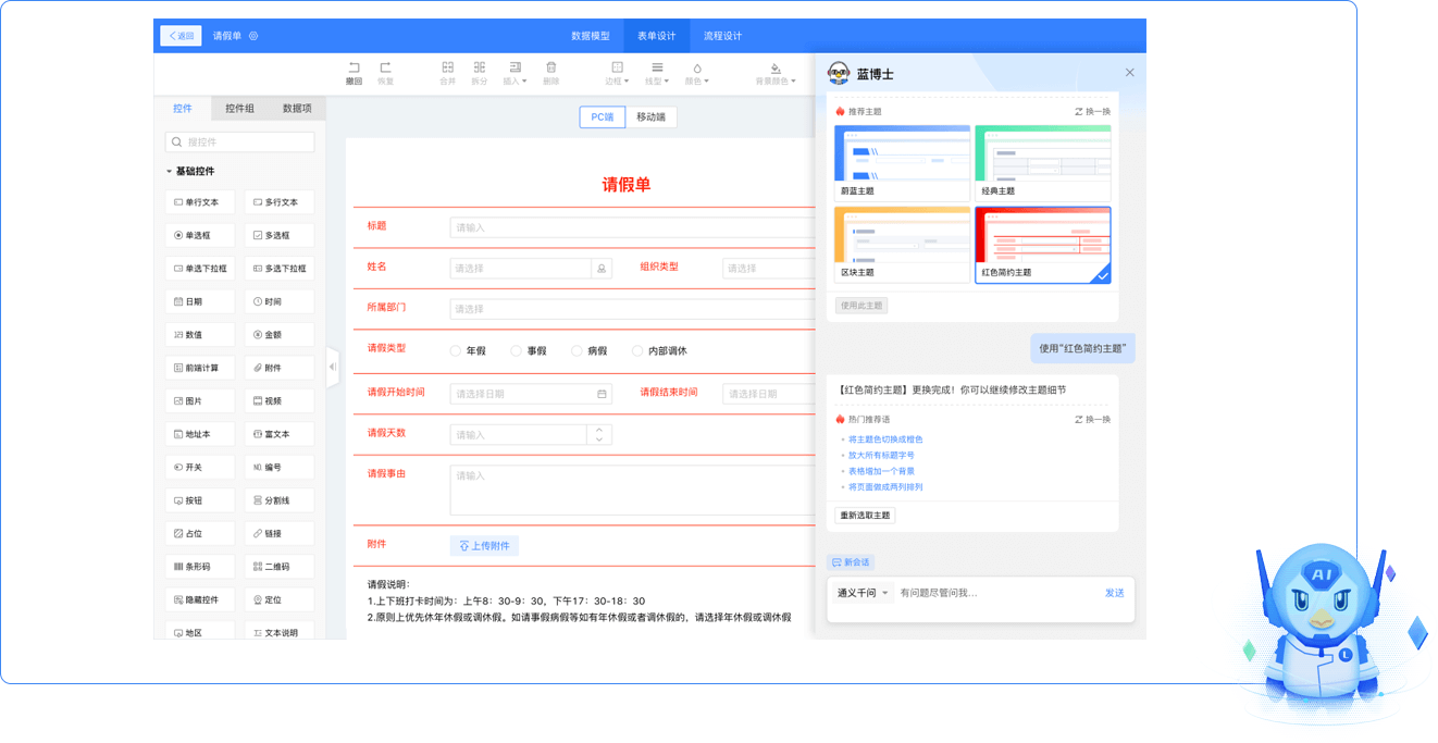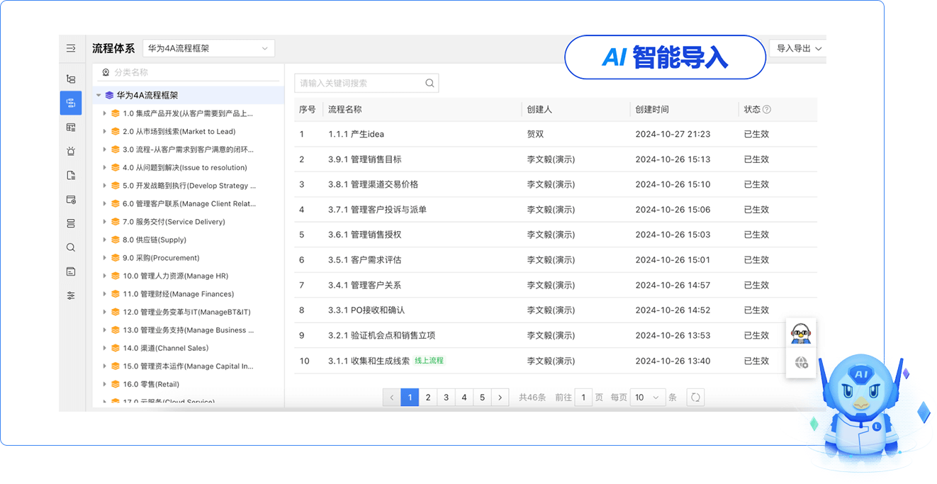上傳企業(yè)的流程體系文件或制度文件中的流程和表單,AI進行自動識別生成規(guī)范的流程和表單,幫助流程管理員快速配置業(yè)務流程,提升流程建設的效率。