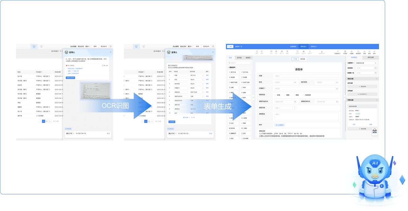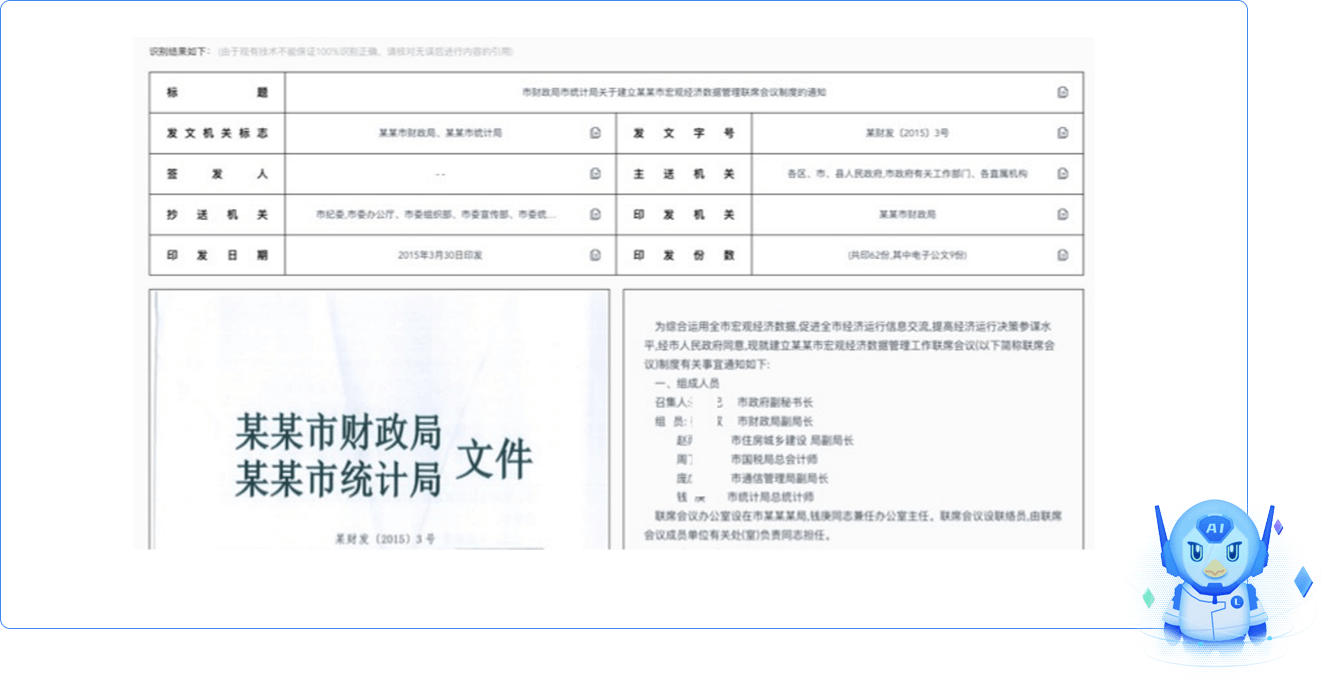 通過OCR識圖及算法糾偏,實現(xiàn)對紙質(zhì)、電子表格等快速轉(zhuǎn)換為審批表單,降低人工工作量,提升業(yè)務系統(tǒng)設計效率。