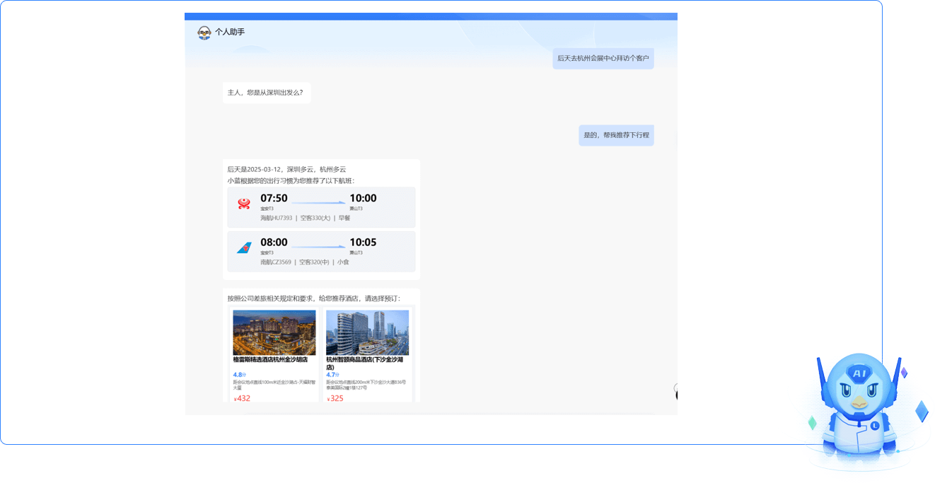 AI擬人化理解自然語言,分析意圖,定位所在地,獲取地域天氣(接口對接取天氣信息),分析出行人的偏好,結(jié)合天氣信息和偏好推薦合理行程和交通工具,一系列復雜的人工場景,全部智能化,提交工作效率。