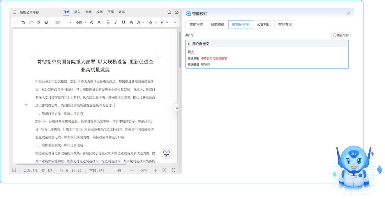 同時支持敏感審校能力,能夠?qū)Σ块T名稱、固有表述、領導姓名/職位以及搭配等敏感類信息進行自動糾錯,提高審批水平、前置避免錯誤發(fā)生。