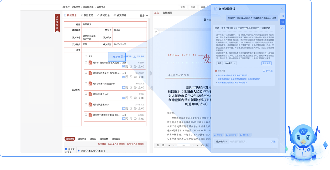 可通過提取公文要素,輔助審批人快速了解公文內(nèi)容,分析公文關鍵要素;審批時自動展示同類公文,輔助決策者參考歷史處理邏輯,減少重復溝通;同時支持對公文內(nèi)容進行連續(xù)追問,深度挖掘公文內(nèi)容,進而提升共享審核人員的作業(yè)效率,輔助人工審核,提高審核質(zhì)量、降低人力成本。