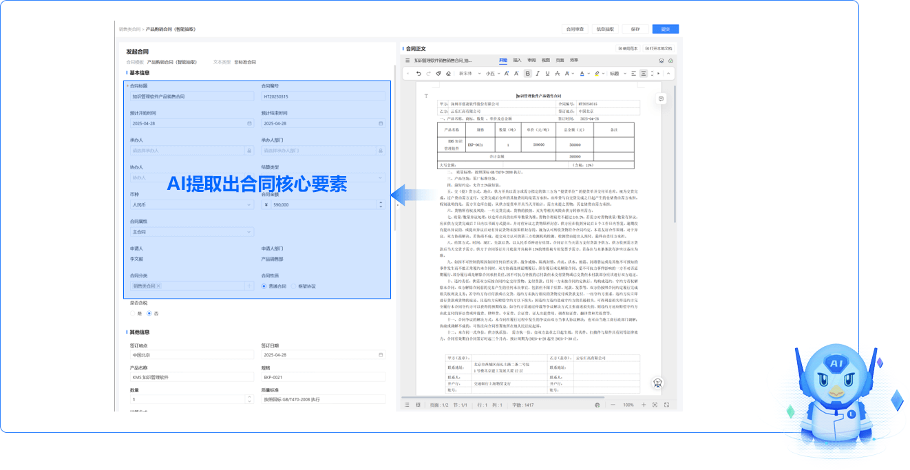 AI提取出合同核心要素,例如標題、編號、金額、付款計劃等。并且將這部分要素填充到結(jié)構(gòu)化的表單中用于合同審批流程發(fā)起。節(jié)省用戶發(fā)起非標合同時需要手動錄入流程相關信息的操作。