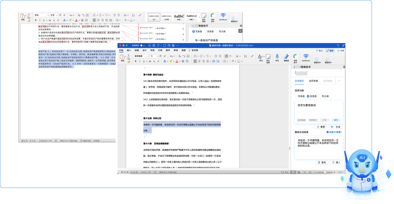 根據(jù)用戶描述的合同類型與需求生成出合適的合同示范文本。支持AI推薦合適的合同條款模板,例如保密協(xié)議、知識產(chǎn)權條款等,并提供條款解釋和適用場景;支持AI改寫、擴寫等潤色操作。簡化合同起草過程,確保合同條款的合規(guī)性和適用性,提高合同質(zhì)量。