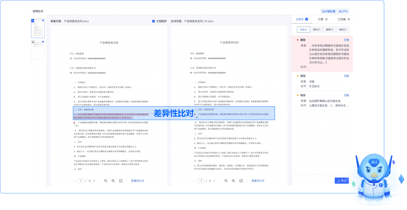 支持對兩份不同的文檔進行差異性比對,支持 docx 流式文件、版式文件、圖片/掃描件等之間的差異比較與標識。通過系統(tǒng)自動識別差異,可實現(xiàn)流程自動通過等智能審批需求,提高合同審查效率,確保合同版本的一致性,避免因版本差異導致的誤解或錯誤。