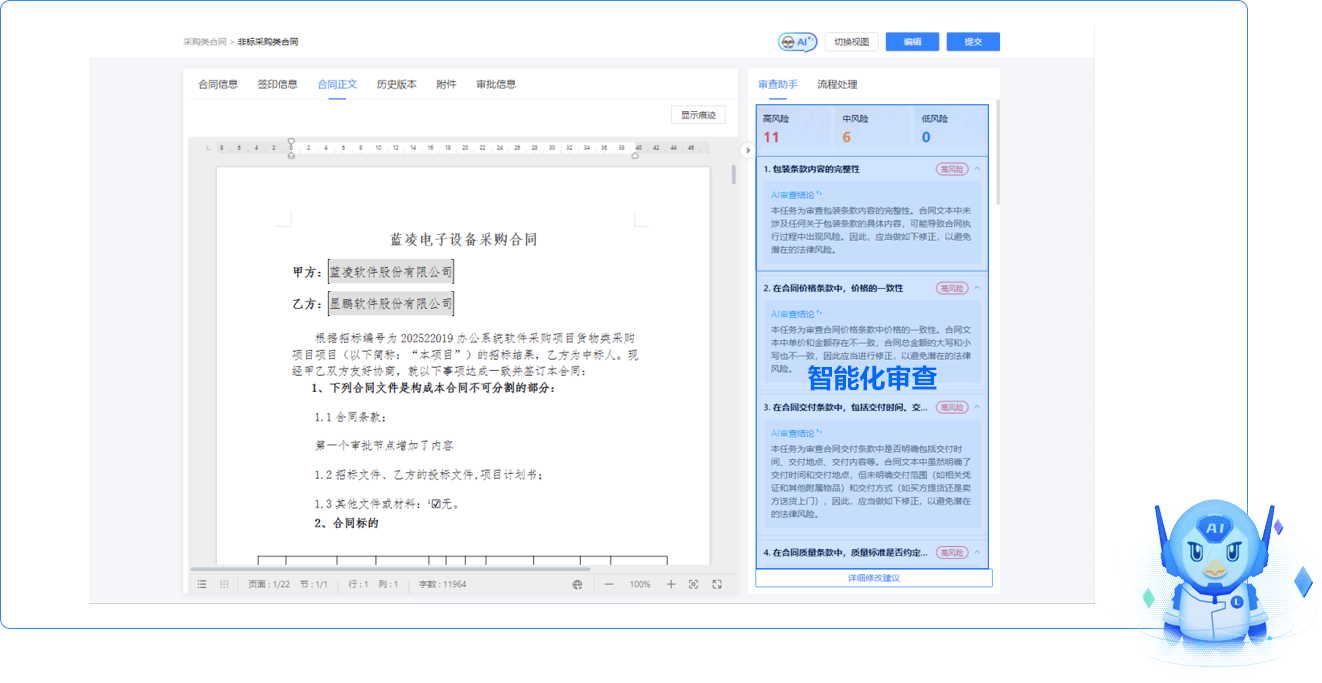 依賴垂類大模型的能力,可以實現(xiàn)對合同文本的智能化審查。這種技術能夠快速識別出合同中潛在風險條款,并提供具體的修改建議,幫助用戶優(yōu)化合同內(nèi)容,提前規(guī)避合同風險,減少法律糾紛和財務損失。