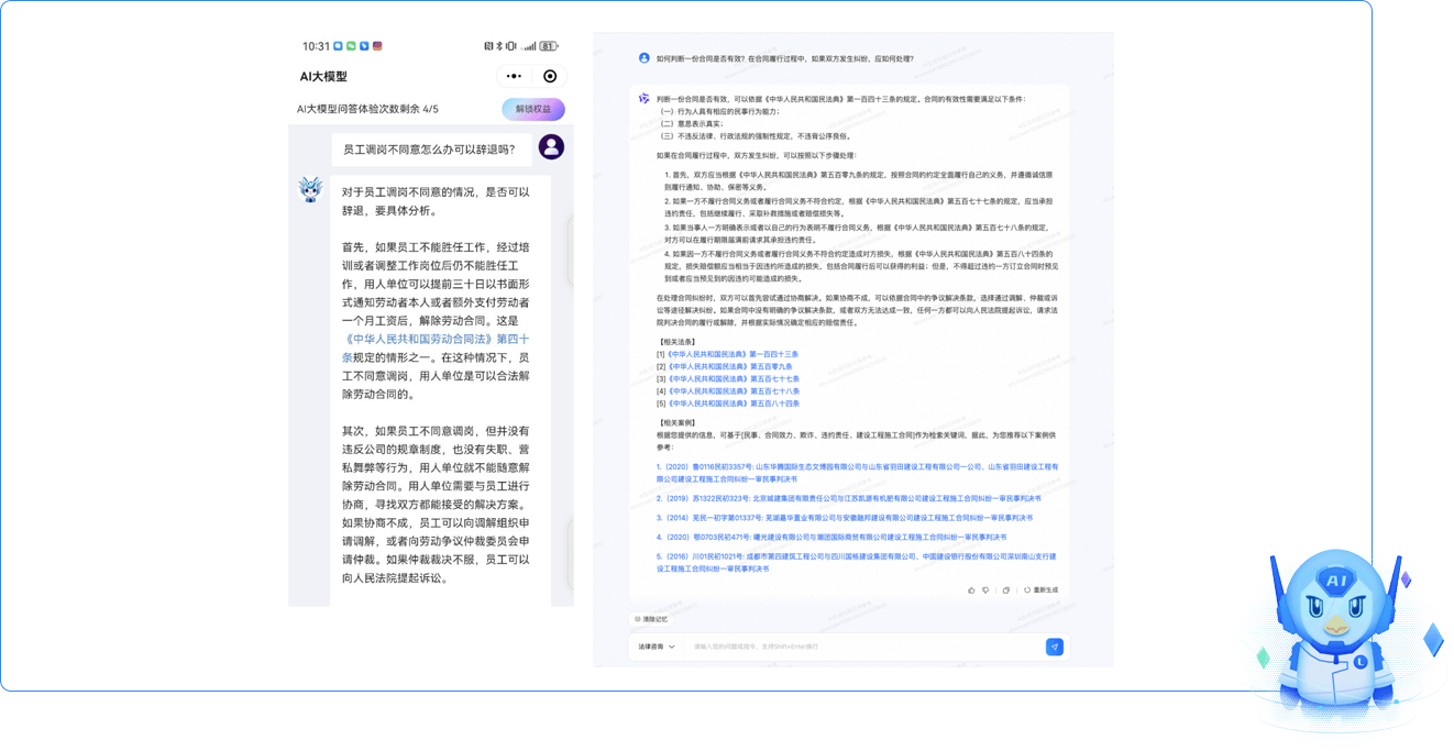 支持法律法規(guī)檢索、類案檢索、法律咨詢服務等,允許用戶對法律相關知識事務進行提問咨詢;通過描述相關案情信息,自動分析案件的核心事實、法律關系、爭議焦點等生成相似案例,并給出案例之間的相似點和差異點。