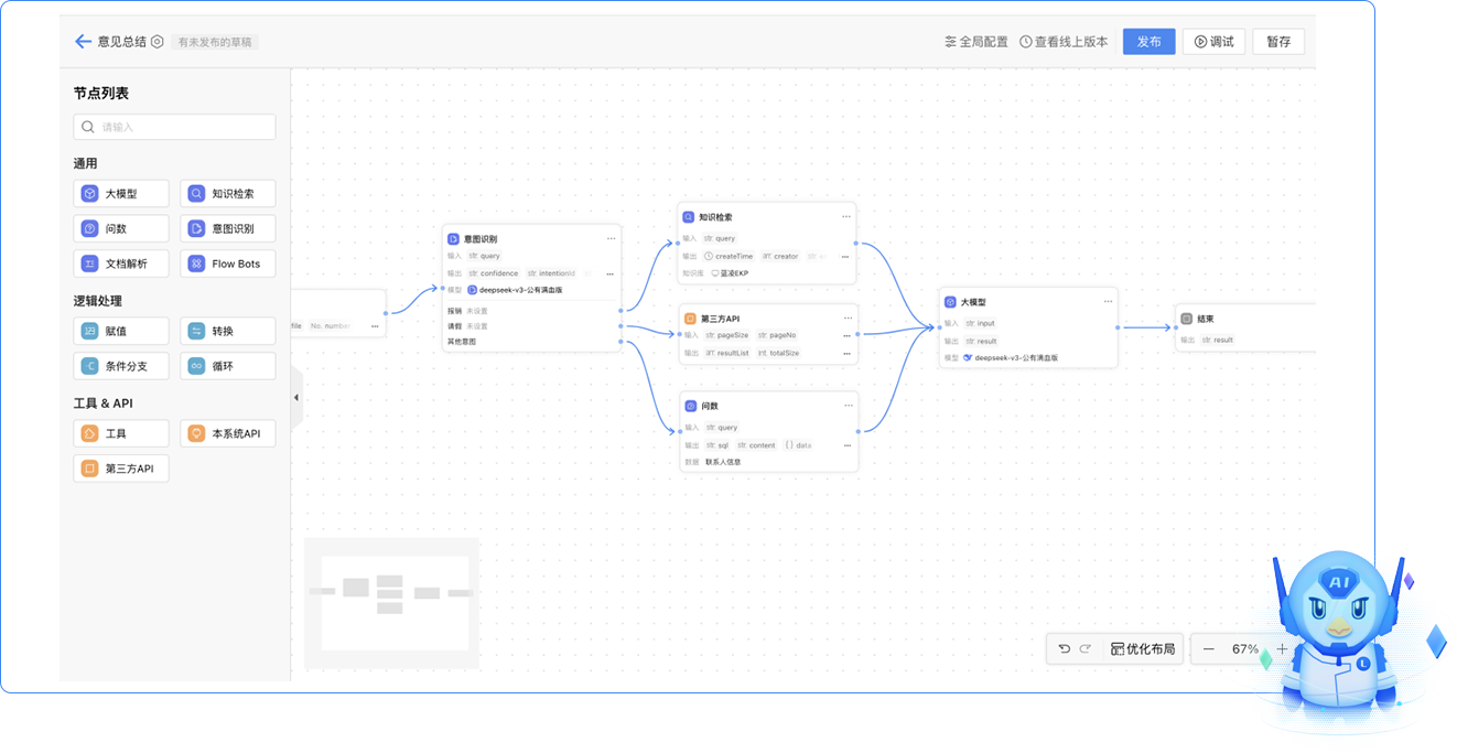 藍博士FlowBots :開箱即用大模型/問數(shù)/檢索節(jié)點,與藍凌產(chǎn)品 API 無縫對接,配備外部插件工具,支持拖拉拽 Flow搭建,并實時跟蹤調(diào)試效果