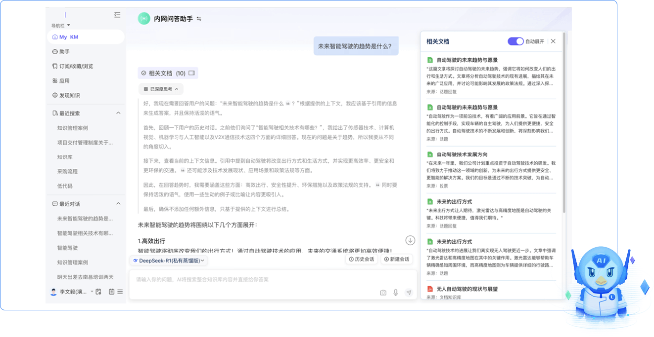 攜手藍凌對接私有大模型通義千問+DeepSeek,上傳近萬份知識文檔為AI應用搭好基礎。全新工程技術智能知識庫系統(tǒng),實現(xiàn)了智能搜索、智能問答、智能助手等系列功能,構(gòu)建了企業(yè)知識中樞,為一線施工人員、管理人員等提供個性化知識服務