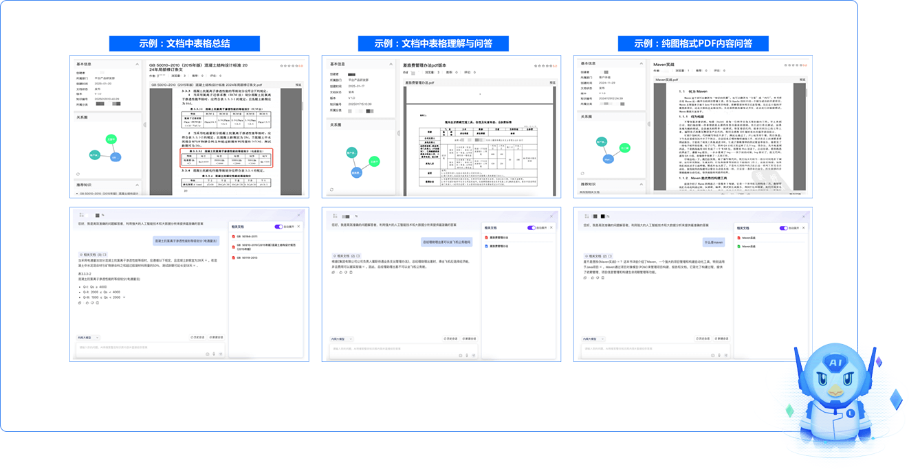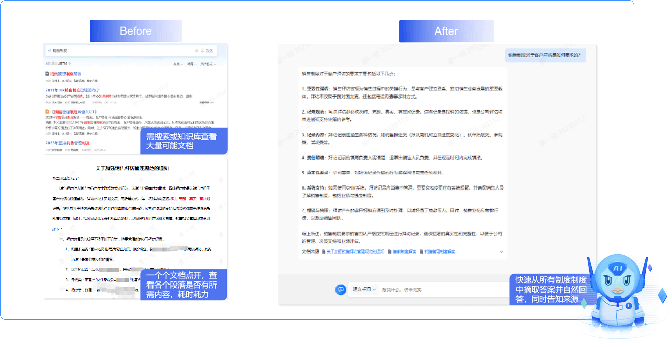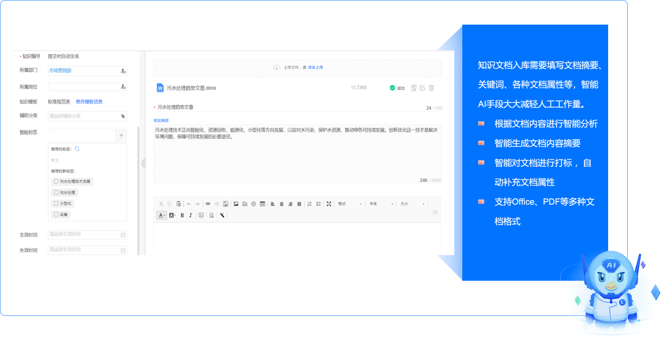 支持將不同格式文檔“投喂”AI,如WORD、PDF、表格等格式,通過AI的總結(jié)、理解與問答,可以快速生成AI問答服務,在企業(yè)內(nèi)部提供各種專業(yè)領域的員工自助問答助手,提升知識傳遞效率。