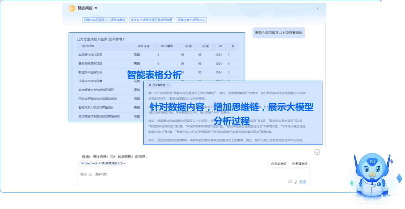 智能問數(shù):智能問數(shù)機器人可以幫助企業(yè)員工快速獲取業(yè)務數(shù)據(jù),支持多維度分析和復雜查詢,提升決策效率,若使用R1版本的DeepSeek模型,則可查看問數(shù)分析的推理過程
