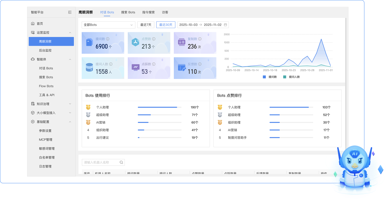 藍博士ChatBots:具備專屬數(shù)據(jù)語料、模型工作規(guī)劃、工具&插件調(diào)用能力;支持多輪對話交互與不同場景植入;可實現(xiàn)知識數(shù)據(jù)聯(lián)動及接口自動讀寫