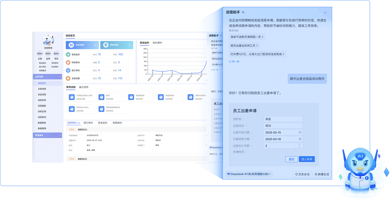 支持員工輸入需求描述(如"明天出差去南昌培訓兩天"),AI自動推薦最匹配的流程模板(如《員工出差申請》),顯示發(fā)起當前流程的需提供資料以及相關要求;提高員工找流程效率