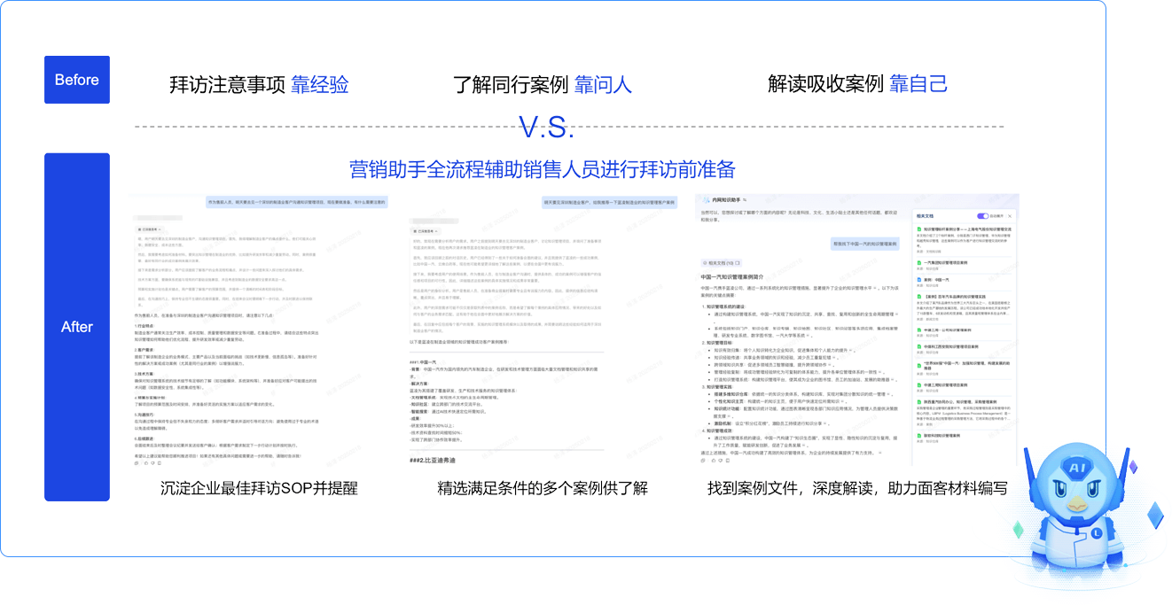 在銷售過程中的每個關鍵環(huán)節(jié),AI結(jié)合具體項目類型進行案例和指引內(nèi)容的精準推送,輔助進行面客材料的快速編寫。