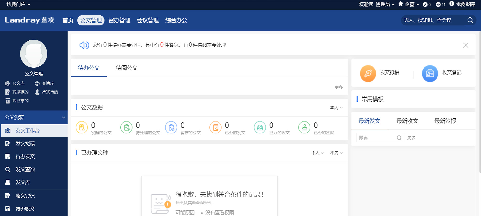 通過藍凌智能OA打造在線化公文管理,實現(xiàn)發(fā)文、收文、流轉、審批等管理,有效提升公文效率,實現(xiàn)無紙化辦公