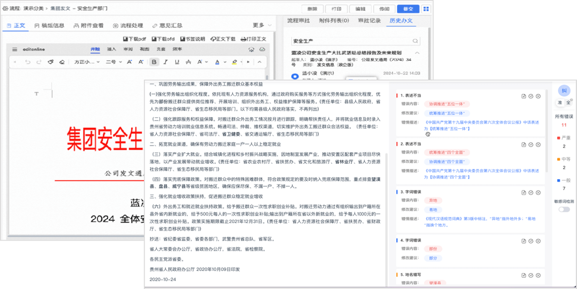 支持國企集團各類復(fù)雜公文流轉(zhuǎn)場景,全程留痕;移動簽批更高效;文轉(zhuǎn)督辦,助推執(zhí)行力。引入WPS等"流版簽",滿足信創(chuàng)適配需求