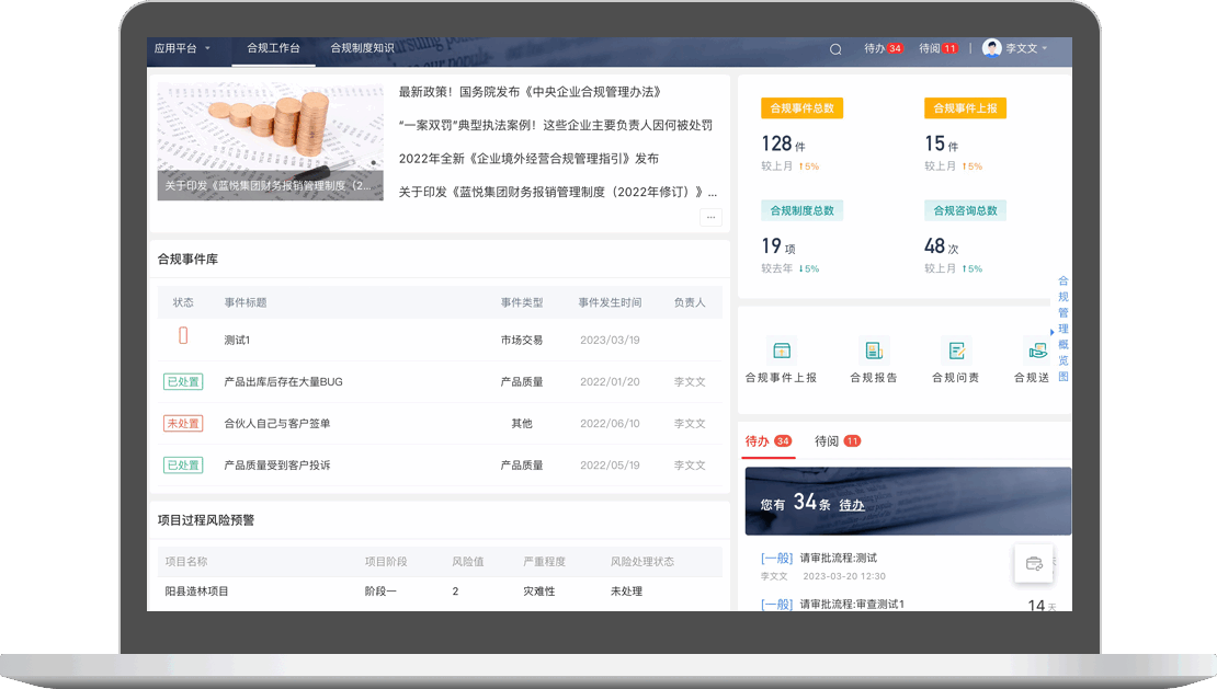 通過構(gòu)建合規(guī)門戶、合規(guī)咨詢、合規(guī)問責(zé)、合規(guī)考核、合規(guī)舉報、合規(guī)報告、合規(guī)風(fēng)險提示、合規(guī)知識庫、反洗錢工作,覆蓋集團及下屬子公司合規(guī)管理,助力企業(yè)實現(xiàn)合規(guī)閉環(huán)管理,提升合規(guī)經(jīng)營能力