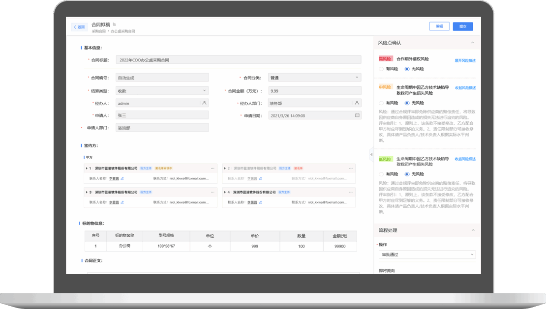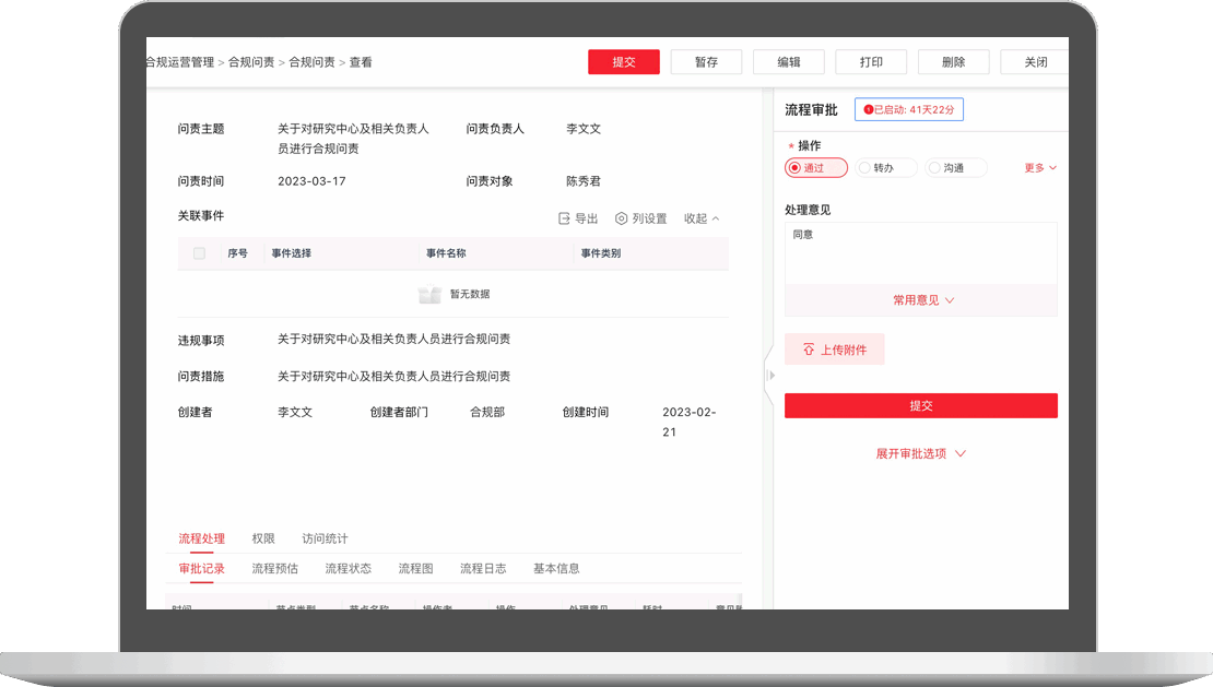 構(gòu)建統(tǒng)一法律內(nèi)控合規(guī)系統(tǒng),涵蓋合同審批、合同檢索、授權(quán)管理、法律服務(wù)、風(fēng)險處置、案件管理、決策流調(diào)與檢索、用印流調(diào)、內(nèi)控制度檢索、風(fēng)控大數(shù)據(jù)等功能,支持合規(guī)工作中各類流程、文檔統(tǒng)一管理,進一步保障了合規(guī)管理工作有序、高效開展