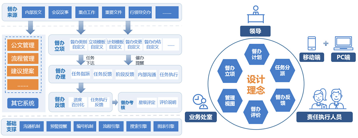 面向金融機構(gòu)的領(lǐng)導(dǎo)、業(yè)務(wù)處室、責(zé)任執(zhí)行人員,提供督辦新建、立項審批、制定計劃、任務(wù)指派、任務(wù)反饋到督辦考核的全生命周期管理