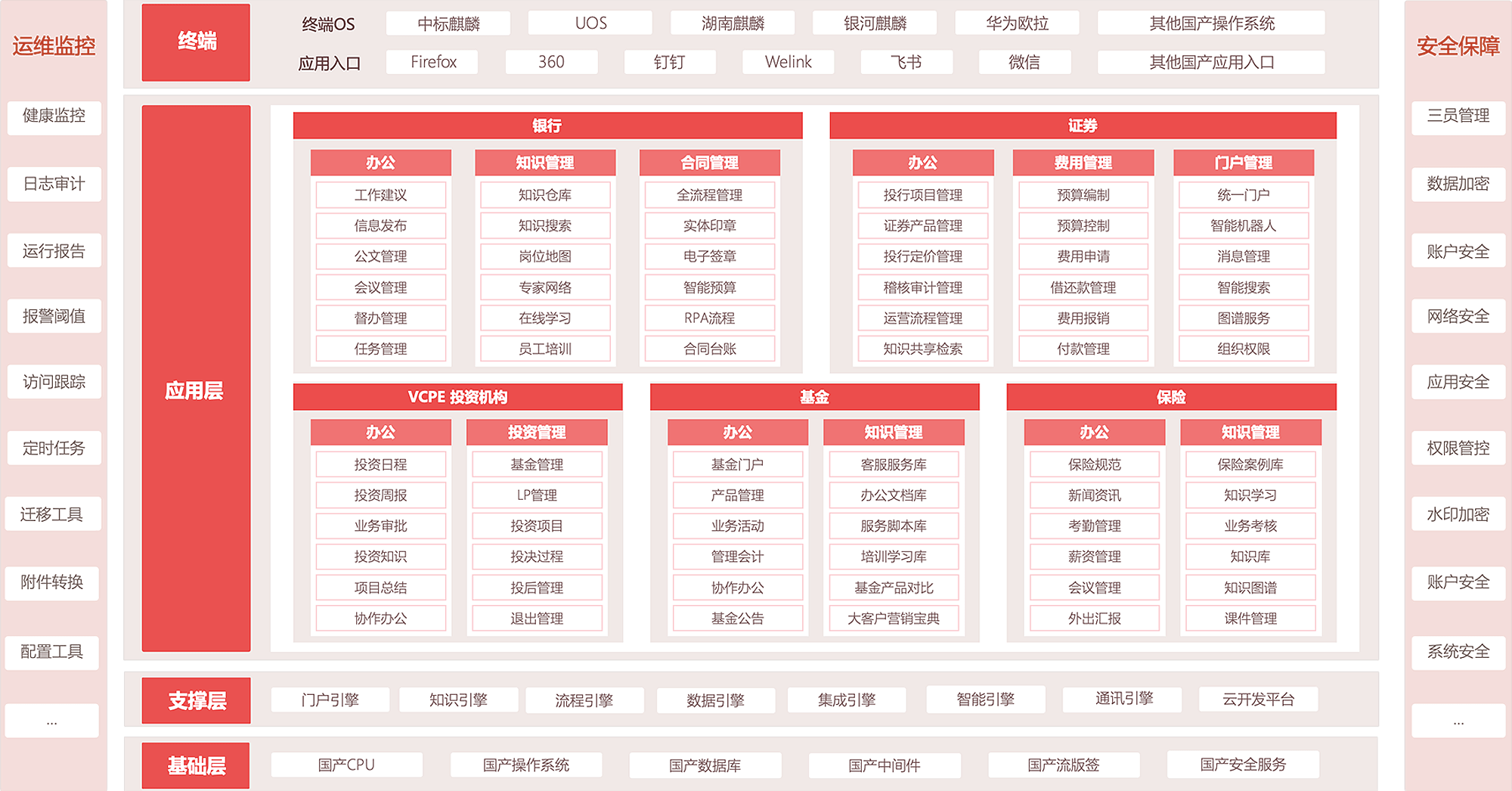 對現(xiàn)有產(chǎn)品架構(gòu)進(jìn)行升級,完成了標(biāo)準(zhǔn)產(chǎn)品90+個模塊在信創(chuàng)產(chǎn)品中的適配性,完成20+個自研模塊的信創(chuàng)改造,完成50+類流程外接集成接口,滿足業(yè)務(wù)辦公需求,全面提升辦公效率