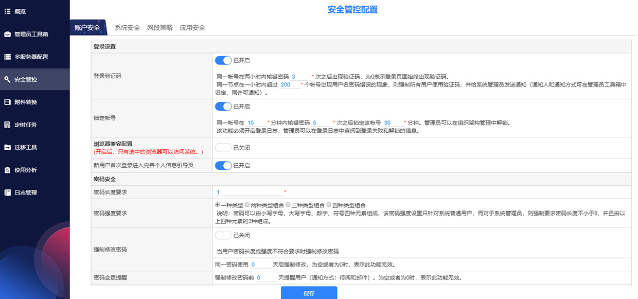 賬戶安全:對登錄方式、登錄終端、密碼策略、身份校驗等進(jìn)行配置
