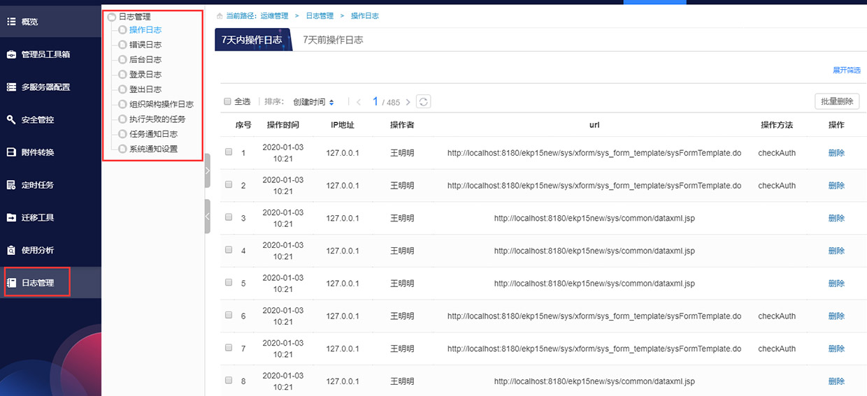 日志管理:進(jìn)行分類日志管理,包括操作日志、錯誤日志、后臺日志、登錄日志等