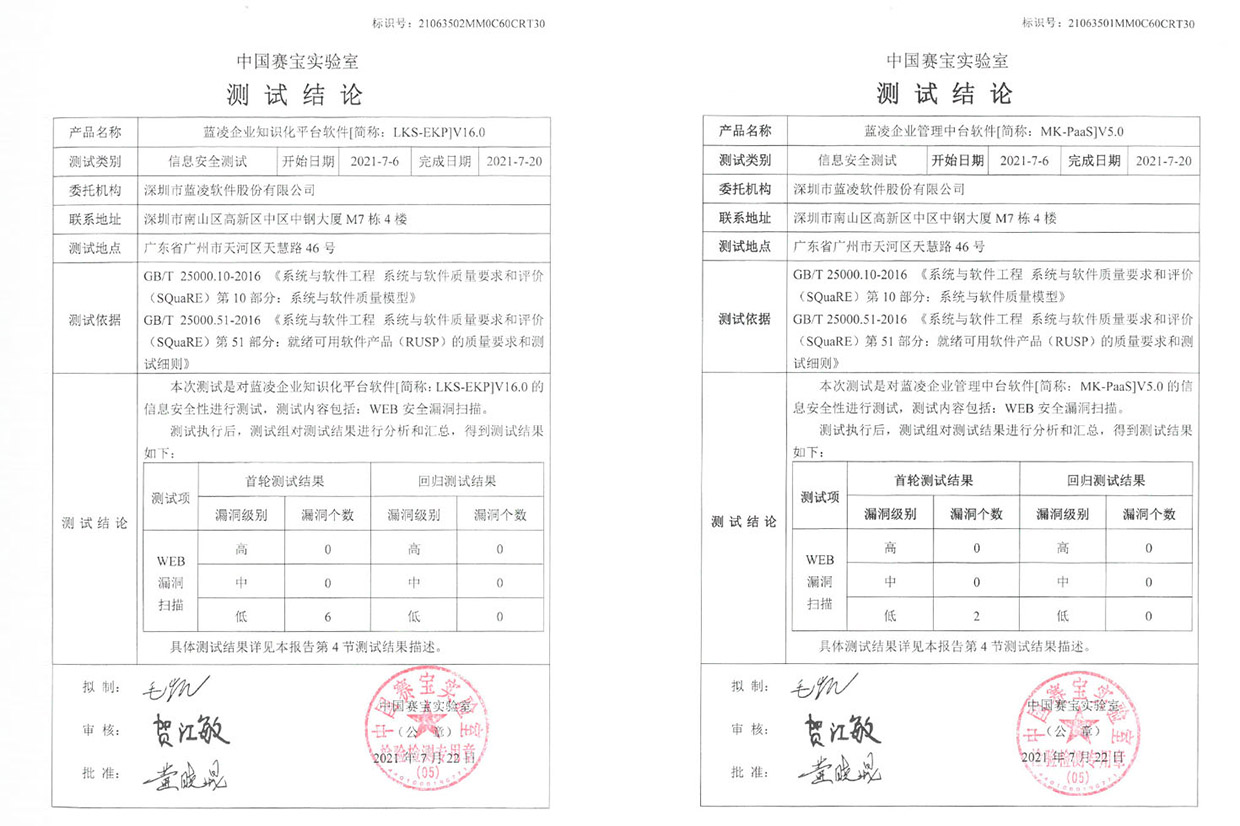 賽寶信息安全測試:賽寶實驗室對藍(lán)凌體系化產(chǎn)品進(jìn)行了信息安全測試,主要測試內(nèi)容為WEB安全漏掉掃描,發(fā)現(xiàn)漏洞個數(shù)為0