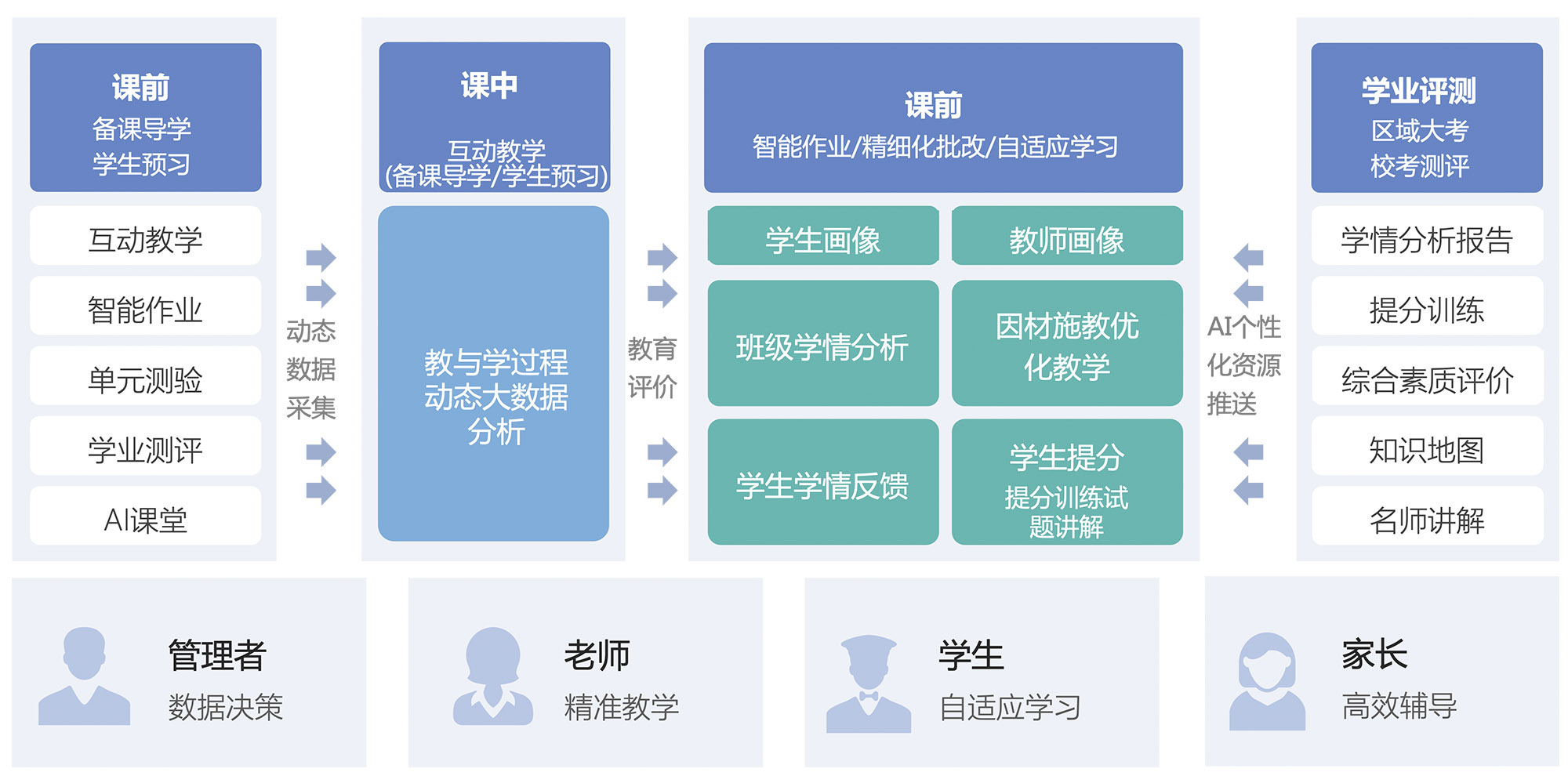打造覆蓋課前、課中、課后的信息化教學應用,拓展學生“學”的空間,豐富教師“教”的手段,實現(xiàn)教育資源共享和科學教育管理