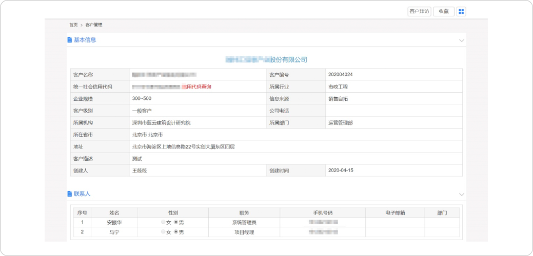 提供客戶基本信息的錄入、修改、查詢、分析等方面的功能,對客戶進行分級劃分,優(yōu)先跟蹤重點客戶;提供客戶拜訪記錄保存,促進客戶商機挖掘與轉(zhuǎn)化,進而促進簽單。