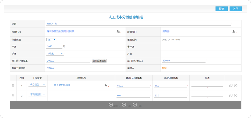 針對設(shè)計院不同的人工成本分攤模式,系統(tǒng)提供了人工成本直接分攤和人工時分攤兩種方式,可以很好滿足不同設(shè)計院粗放式和精細化管理的需求。