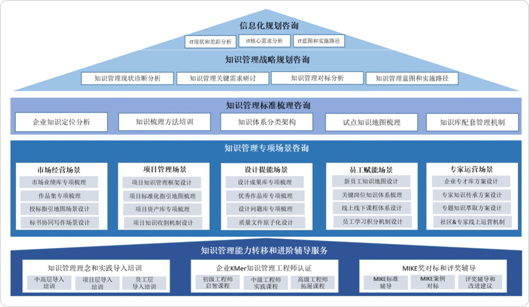 智慧設(shè)計院信息化規(guī)劃、知識管理規(guī)劃及應(yīng)用咨詢服務(wù)、KM工程師認證培訓(xùn)、MIKE申報輔導(dǎo)等