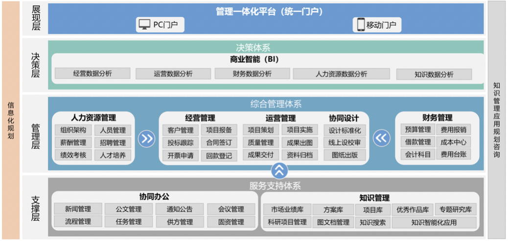 簡(jiǎn)介: 從決策、業(yè)務(wù)、管理、知識(shí)四個(gè)維度,支撐勘察設(shè)計(jì)企業(yè)提升綜合管控能力、提效市場(chǎng)經(jīng)營與項(xiàng)目運(yùn)營管理;讓知識(shí)驅(qū)動(dòng)科技創(chuàng)新,賦能復(fù)合型人才培養(yǎng),打造技術(shù)領(lǐng)先的智慧設(shè)計(jì)院。