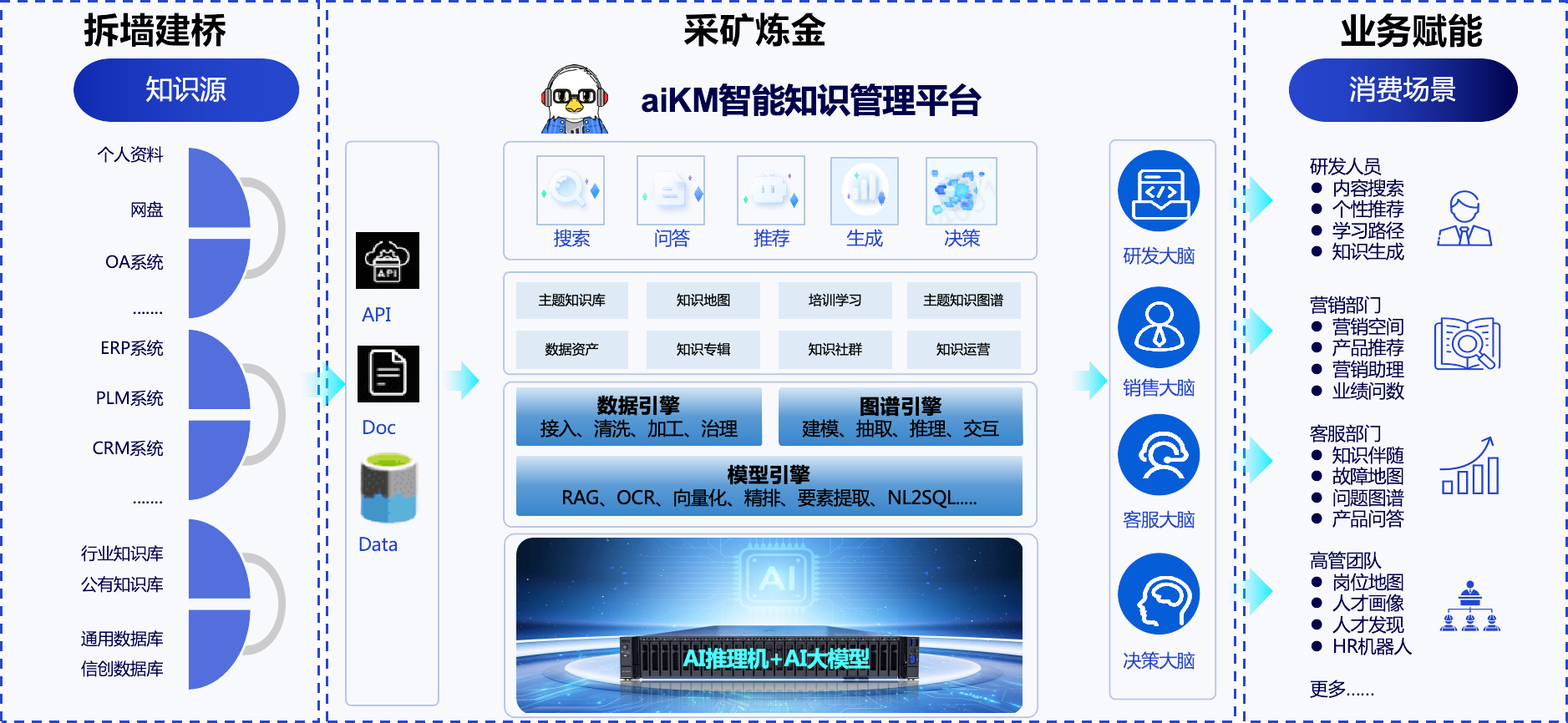 支持異構(gòu)源接入:提供強(qiáng)大的API和iPaaS對(duì)接接口,企業(yè)可通過(guò)自定義數(shù)據(jù)流,將自身獨(dú)有的系統(tǒng)接入aiKM