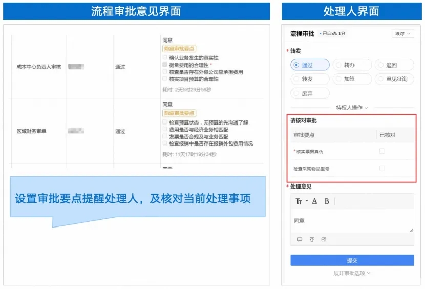 針對流程處理人需核對單據(jù)中內(nèi)容較多,容易出現(xiàn)遺漏的情況,將審批要點(diǎn)融入流程中,必須勾選確認(rèn),方可通過流程,進(jìn)而減少審批過程出錯(cuò)幾率。