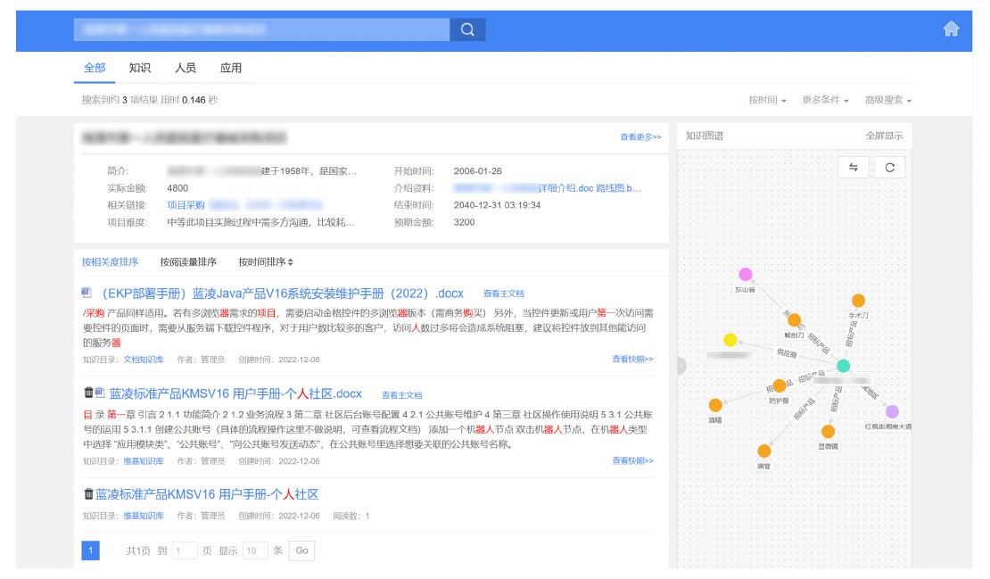 作為大型能源企業(yè),針對知識倉庫中海量文檔,構(gòu)建關(guān)系型圖譜搜索,讓不同文檔中相關(guān)屬性以知識卡片在圖譜中展示,讓知識獲取更便捷