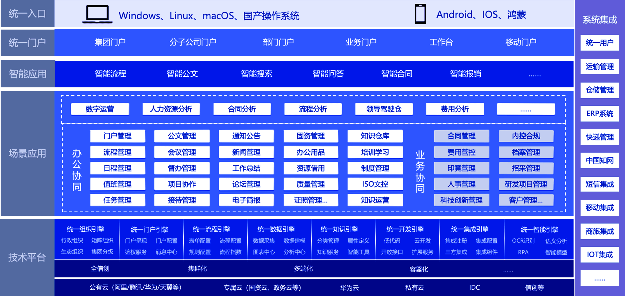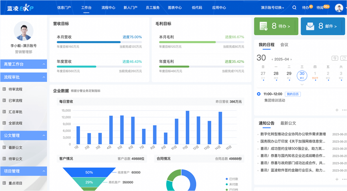 用藍凌平臺升級智慧辦公、合同等系統(tǒng),新平臺支持性能可伸縮、應用可擴展、業(yè)務可集成;新OA滿足信創(chuàng)要求,提效組織協(xié)同與集團管控,智慧合同覆蓋合同擬稿、審批、簽訂、履約等全程管理。