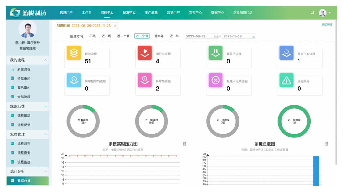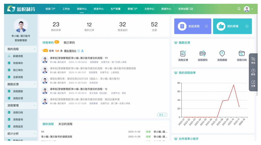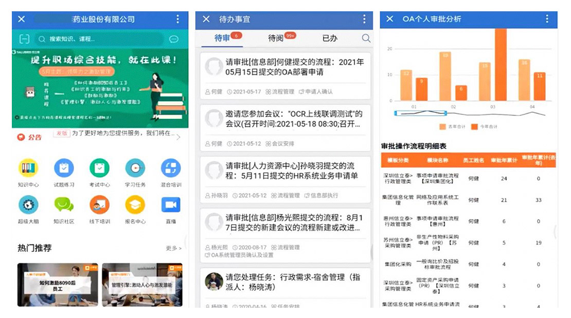 新OA平臺(tái)面向數(shù)千員工,不僅支撐“人財(cái)物事”協(xié)同,更集成ERP、WMS等10多個(gè)業(yè)務(wù)系統(tǒng),提效業(yè)務(wù)協(xié)作;“信學(xué)堂”知識(shí)門戶,賦能新藥研發(fā)創(chuàng)新;針對(duì)不同業(yè)務(wù)流程、業(yè)態(tài)、子公司的流程分析,實(shí)現(xiàn)分級(jí)優(yōu)化提效與精細(xì)化管理