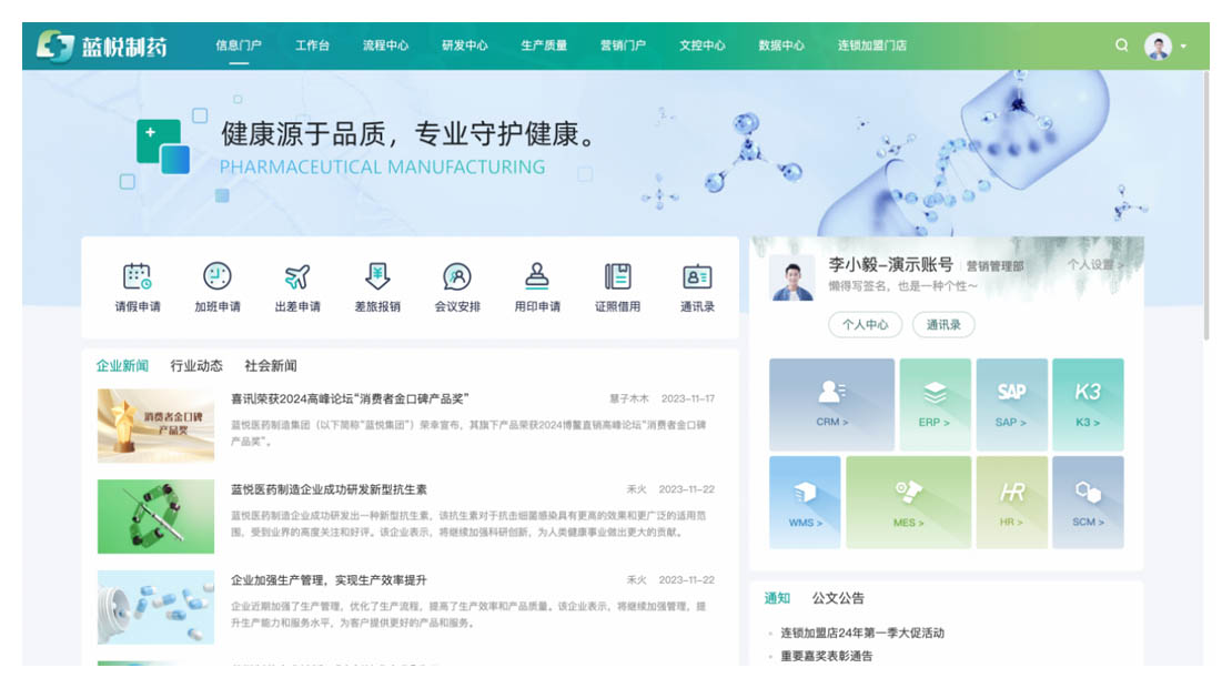 作為業(yè)務(wù)覆蓋藥品、健康品、中藥資源和醫(yī)藥物流的大型集團(tuán),構(gòu)建數(shù)字化辦公平臺(tái),統(tǒng)一集團(tuán)、事業(yè)部等多級(jí)門戶,打造專屬移動(dòng)辦公平臺(tái)、知識(shí)管理平臺(tái),集成QMS、實(shí)驗(yàn)室等近20個(gè)業(yè)務(wù)系統(tǒng),提效員工協(xié)作,助力組織創(chuàng)新發(fā)展