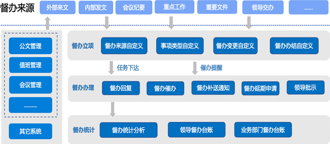 涵蓋立項(xiàng)、反饋、看板、評(píng)價(jià)等督辦板塊,支撐督辦全流程管理,實(shí)時(shí)督辦更靈活