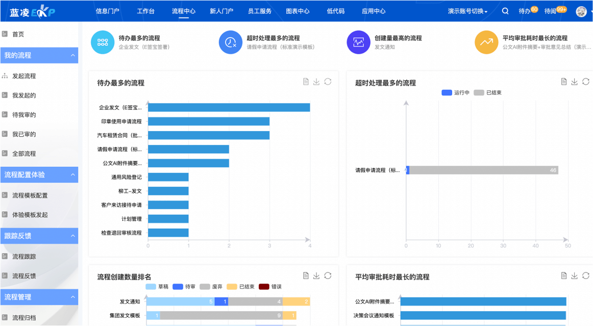 支持對流程運行質量、人員辦件效率、部門辦件效率等進行分析,助力運營持續(xù)優(yōu)化