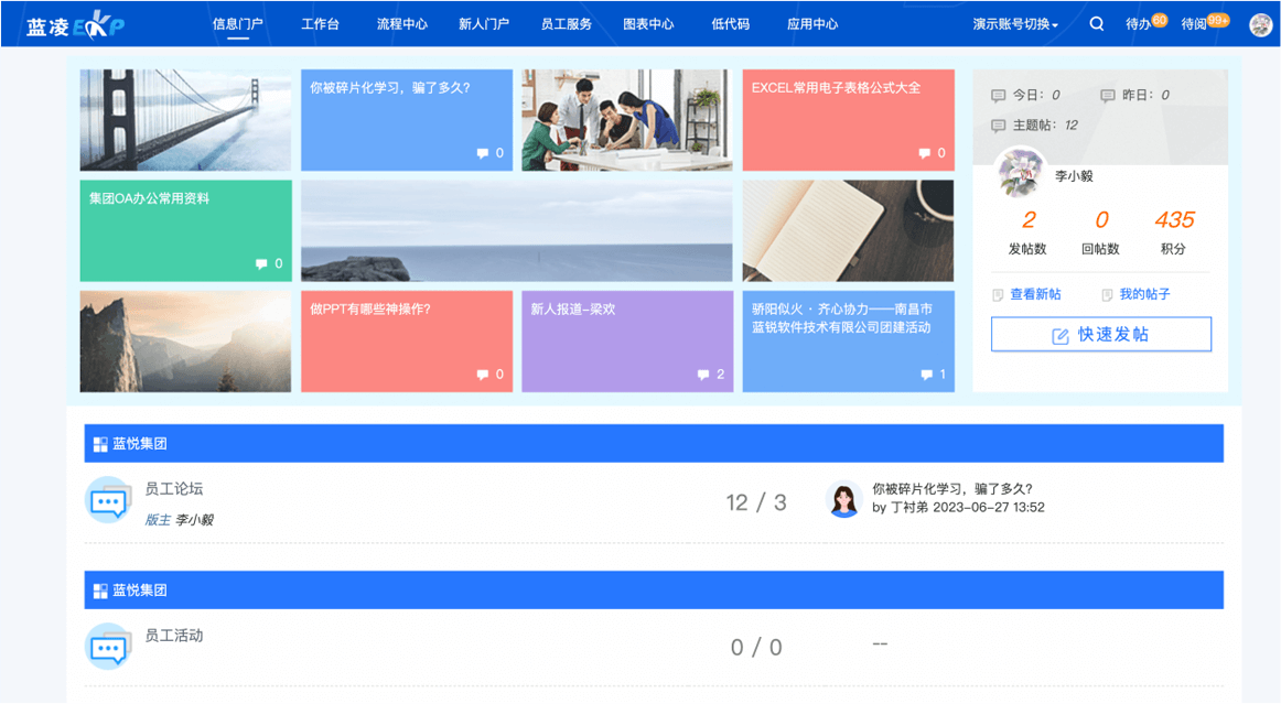 支持在線社區(qū)版塊、帖子、積分管理、匿名發(fā)帖等,活躍文化氛圍,讓員工建言獻策